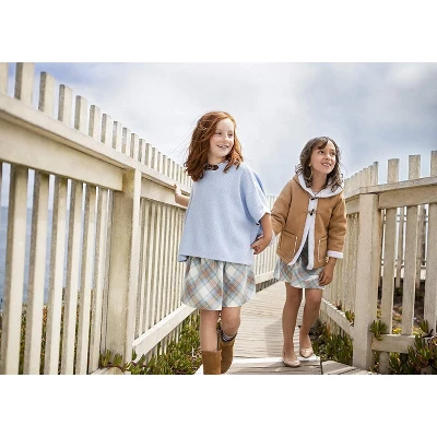 Getting ready has never been easier (or cuter) with our easy pull-on skirt in a beautiful neutral plaid with pops of blue. Features an elastic waistband with a bow and a gently flared skirt. Pairs perfectly with our collection of beautiful organic cotton blouses and sweaters for a complete fall look.