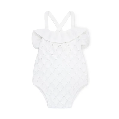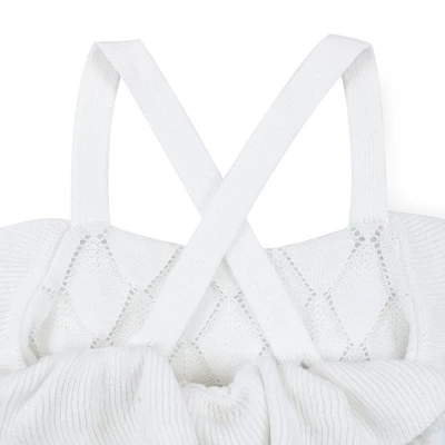 Our sweet sweater romper features a beautiful pointelle knit with ruffle detailing that runs from front to back for a sweet style you’ll love. Features cross back straps with buttons for easy dressing and quick diaper changes. Knit in soft organic cotton that is always soft against little one’s gentle skin.