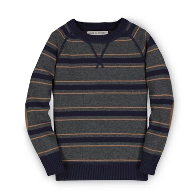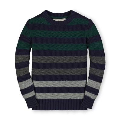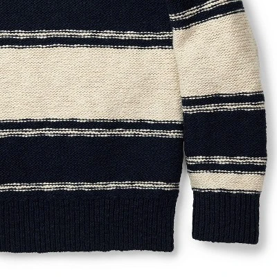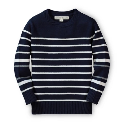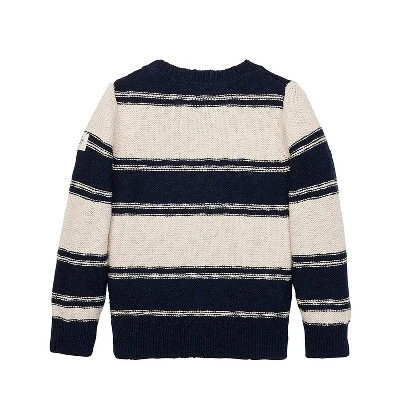 This sweater gets its textural hand-knitted look from chunky yarns knitted in a purl stitch. Finished with rib trims and classically styled in oversized oatmeal and navy stripes, this cool sweater will be your little guy’s favorite new layering piece. Pair with our collection of organic cotton pants and denim for a complete fall look.