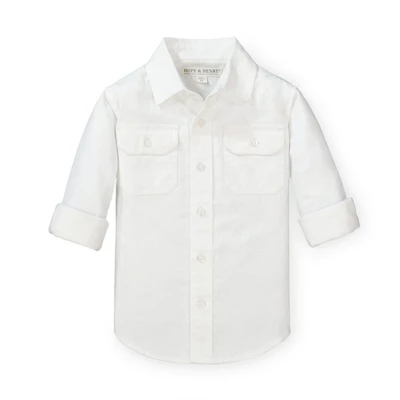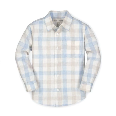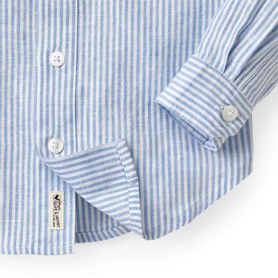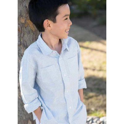 Our long sleeve button down shirt is a relaxed wardrobe staple that can take your guy from picture time to playtime in a snap! The lightweight linen and organic cotton blend is perfect for wearing alone or layering over one of our incredible organic cotton tees. Features matte pearlized buttons at the left chest pocket, cuffs, collar and center placket.