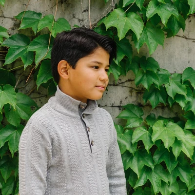Our mock neck sweater in soft organic cotton lends an instantly polished look to your guy. Features a beautiful allover cable knit front and back, faux suede elbow patches, and a contrast button placket. Rib trim at the collar, cuffs, and hem. Looks even more dapper paired with one of our organic cotton button downs!