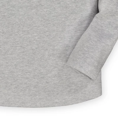 - Henley placket with matte pearlized buttons.