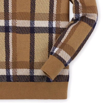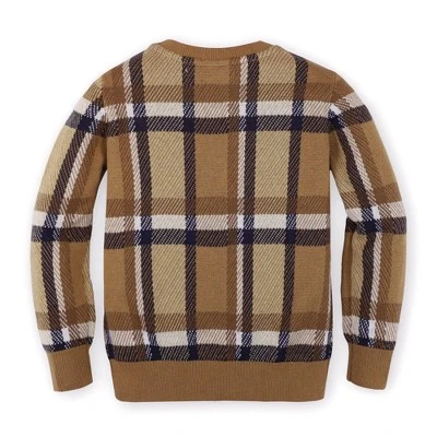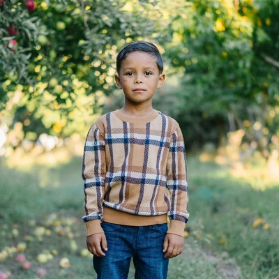 Our stylish crew neck pullover sweater is crafted in soft organic cotton and will keep your guy warm all season long. Features a beautiful intarsia design in a handsome fall plaid and rib knit trim at the cuffs and collar. The easy pullover silhouette pairs perfectly with our collection of organic cotton button downs and pants!