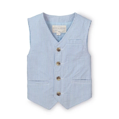 Our traditional seersucker vest shows off his preppy style to perfection. Ours is cut in yarn-dyed organic cotton seersucker, featuring all the classic details: button front with faux horn buttons, welt front pockets and chest pocket, and adjustable back strap.