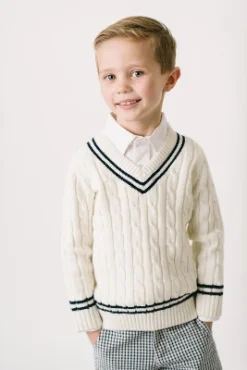 Stay sharp in our preppy cable knit cricket sweater in plush 100% organic cotton. Beautiful cable knit adorns the entire sweater and is trimmed in navy and dark red stripes at the neck, sleeves and hem. This is a sweater to treasure and pass down for years to come.