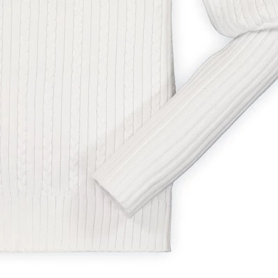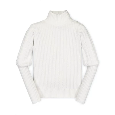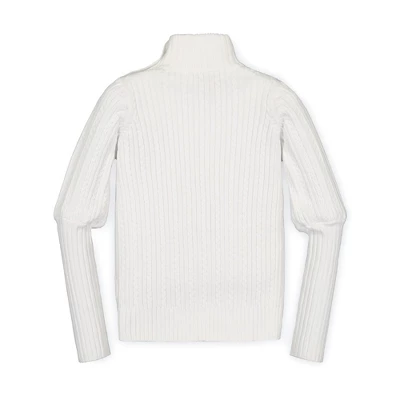 Our balloon sleeve sweater beauty gives your girl the crisp, cool and sophisticated style she needs this fall and winter season. Features a beautiful cable knit, a mock neck with button detail, and dramatic balloon with rib knit sleeves. Looks chic paired with our assortment of organic cotton pants and leggings!