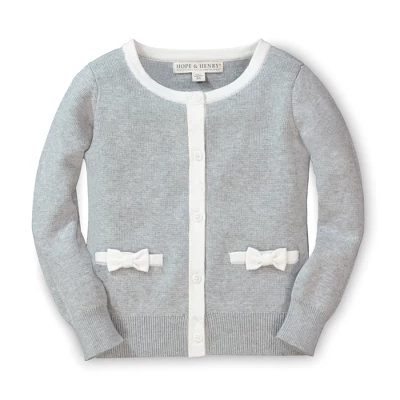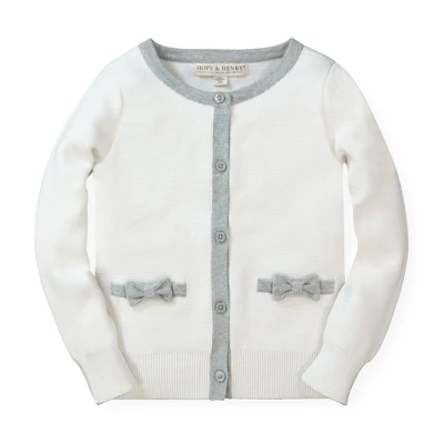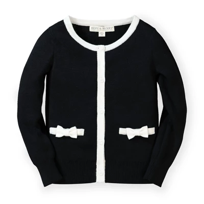 Our adorable bow detail sweater cardigan is a sophisticated wardrobe staple for your little lady! Features contrast trim at the collar, center placket, and pockets, along with cute knit bows for that special touch.