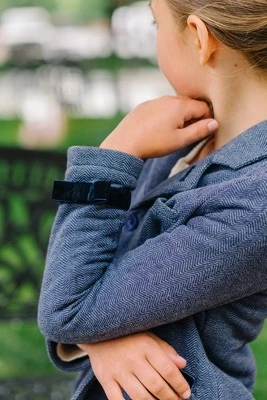 - Faux suede piping, faux leather buttons, and velvet bows at the cuffs.