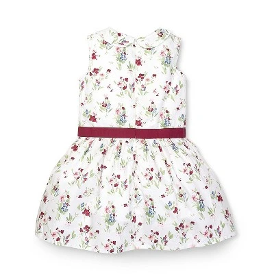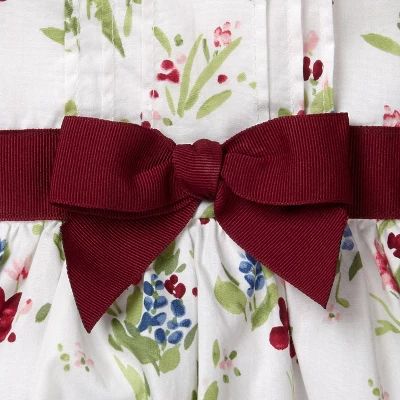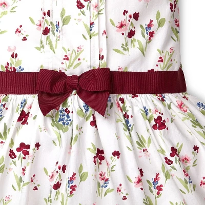 This romantic floral dress is made from super soft fine cotton poplin with a chintz finish that gives this dress a light feminine sheen. Features rows of sweet pintucks at the front, a decorative grosgrain ribbon sash with bow, a slim Peter Pan collar, and a hidden zipper down the back for easy dressing. Fully lined.