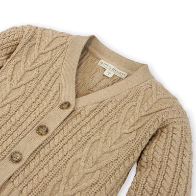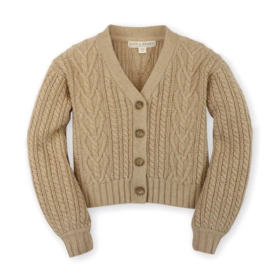 A chunky sweater with feminine flair! Our adorable chunky cable cardigan in soft organic cotton is adorned with a beautiful heart shaped cable on the front and back bodice, with smaller cables on the sleeves. Features belled sleeves and a faux horn button closure for a cool, feminine look. Pairs perfectly with our collection of organic cotton ponte skirts and leggings!