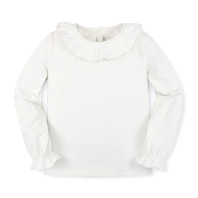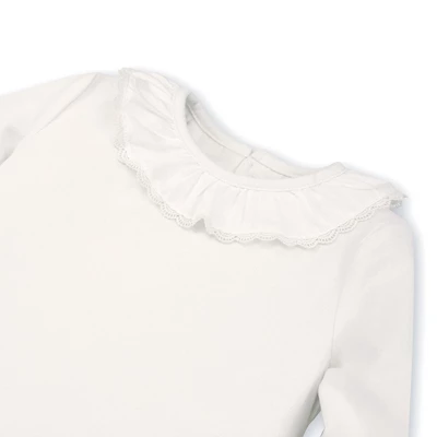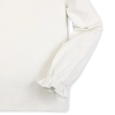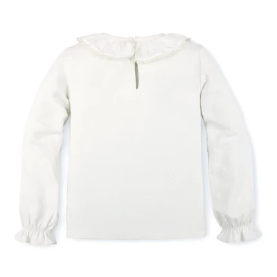 Our wear-with-anything knit top is the fall essential she won’t want to take off. Features a woven ruffle neck collar with lace trim for that special touch, a soft knit bodice, gently belled sleeves with elastic ruffle cuffs, and a back keyhole neck closure for easy on and off. We can’t wait to layer this with our suspender skirts and jumpers!