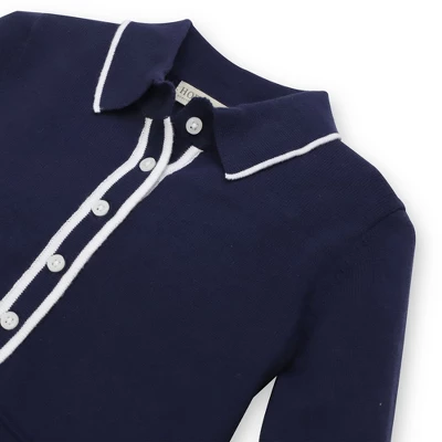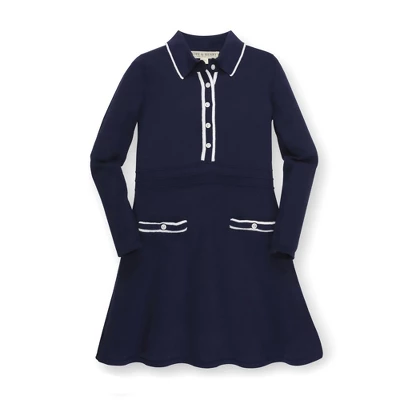 Talk about preppy perfection! Your girl will be ready to twirl in our soft organic cotton fit and flare sweater dress. Features a sweater knit pointed collar, contrast tipping, gold button closure, two front pockets, and rib detailing at the waist. An absolutely darling look for all that fall will bring!