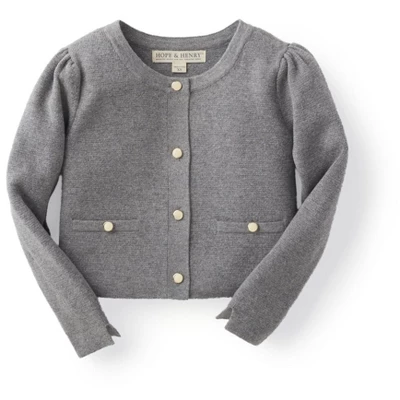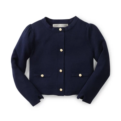 Our adorable fine gauge sweater cardigan is a sophisticated wardrobe staple for your little lady! The textured milano stitch in soft organic cotton gives this classic style the body and structure of a doubleknit, while elegant gold buttons at placket and pockets add just the right amount of sparkle. Layer it over everything!