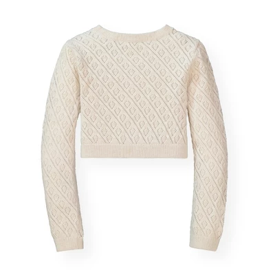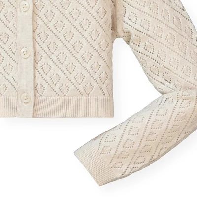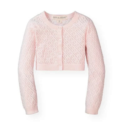 A beautiful layer to top off all her dressy outfits. Our cropped cardigan sweater is knit in fine gauge organic cotton with full fashioning at the armholes and a pointelle pattern throughout. Features delicate pearlized buttons down the center front. A sweet sweater that she will want to wear over everything.