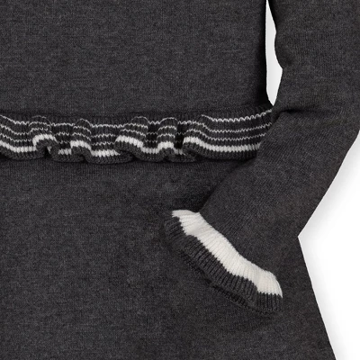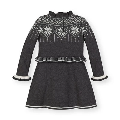 A beautifully neutral and modern fair isle pattern adorns this cozy sweater dress made in soft organic cotton. Features sweet details like ruffled edges with subtle stripe piping and a petite peplum waist