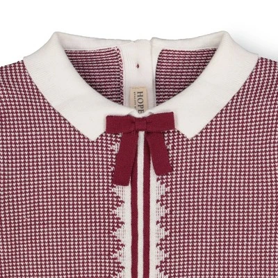 Your girl will be ready to twirl in our soft organic fit and flare sweater dress! Features a sweater knit collar, textured bodice with vintage-inspired trim, a full skirt, and a back keyhole closure. An absolutely darling look.