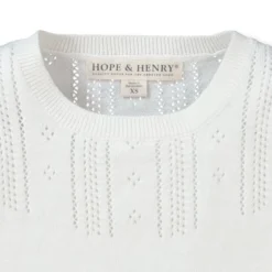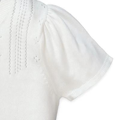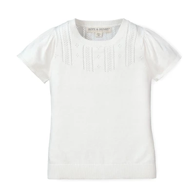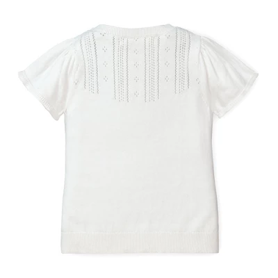 Our short sleeve pointelle sweater top combines pretty and practical into one perfect piece! Features flutter sleeves and pointelle knit details at the front and back yoke.
