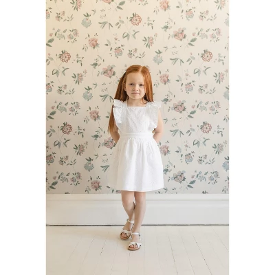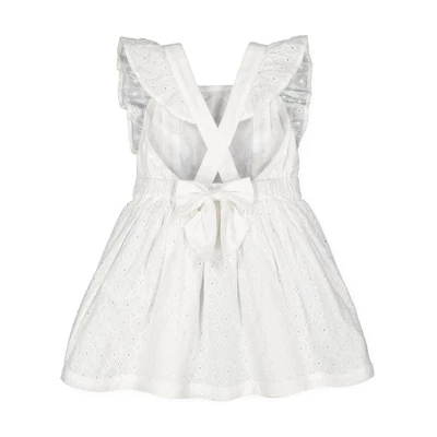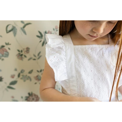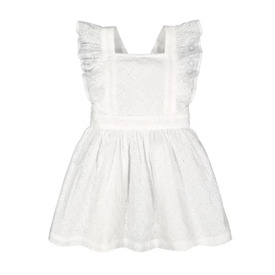 Our romantic pinafore apron dress is perfect for a warm spring or summer day. Features a sweet apron silhouette, ruffle details, and cross back straps with bow – all cut in organic cotton eyelet fabric. Fully lined in organic cotton and tailor made for flower girls, spring weddings, and summer celebrations.