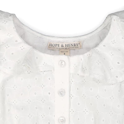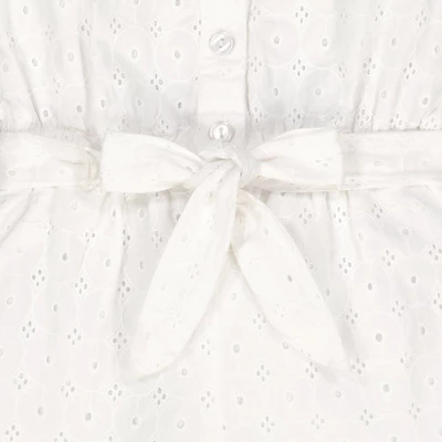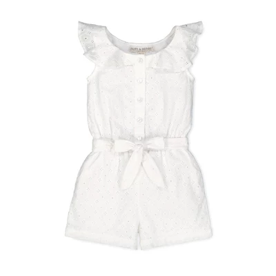 A feminine ruffle collar adds a super cute and on-trend touch to our lightweight romper in a beautiful organic cotton eyelet fabric. Fully lined and features a button front, elastic in the back waistband, and a waist sash with bow for that girly touch. Get the camera ready for those picture perfect moments!