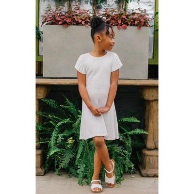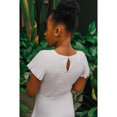 The sweetest sweater dress for spring is here, in a soft organic cotton style that she’ll be wanting to wear time and time again. Features flattering rib knit flutter sleeves, a delicate pointelle stitch on the bodice, and a flared skirt that was made for twirling. A fresh and fun style!