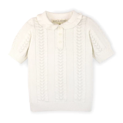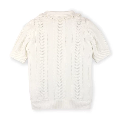 We love this peter pan collar sweater polo in soft organic cotton textured knit. This adorable piece pairs perfectly with our skirts, jumpers, and ponte pants! Features a lovely pointelle knit, feminine puff sleeves, a knit peter pan collar with ruffle edge, and a button placket. She’ll be loving this one all season long!