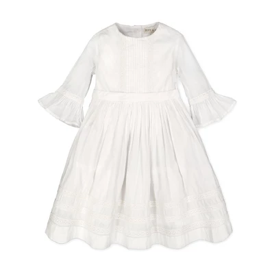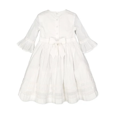 Our elegant special occasion dress in soft organic cotton has all the incredible details that make it perfect for everything from dinner with the family to twirling on a dance floor. Features beautiful embroidered hem details, ruffled cuffs, pintucked bodice, and button closure with bow at the back. Fully lined in organic cotton. A showstopper!