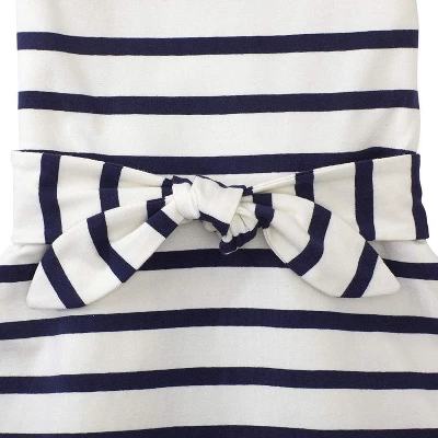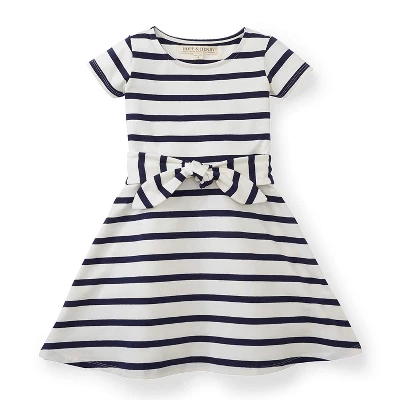 An easy fit and flare silhouette and comfy stretch-blend organic cotton make this nautical-inspired dress an adorable style for family photos and playdates alike. Features short sleeves, a rounded neckline, and a faux waist tie for that feminine touch. A sweet style she’ll be wearing and twirling in all season long.