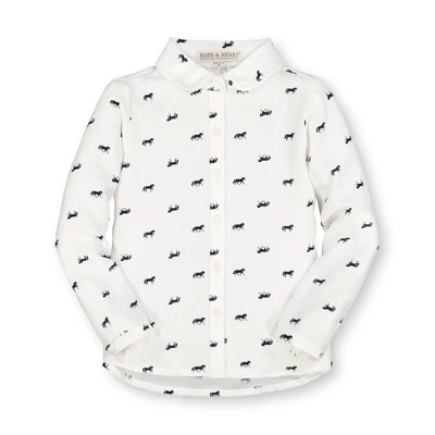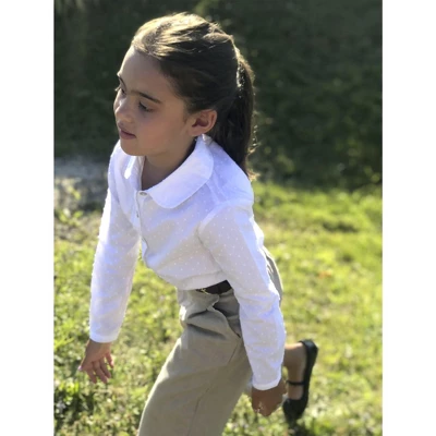 Our sweet button down shirt is crafted in a beautiful swiss dot made from 100% organic cotton for a shirt she’ll be wearing all season long. Features an adorable peter pan collar and real shell buttons at the sleeve cuffs and center front. Top it with one of our pullover sweaters for a complete look!