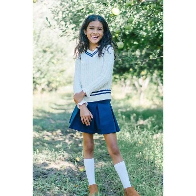 Our pleated schoolgirl skort in soft ponte knit pairs comfort with picture-perfect style. Features preppy pleating, an easy pull-on elastic back waist, and a soft jersey inner short to ensure this look is ready for playtime! Perfect for uniforms and pairs adorably with our collection of organic button down sweaters and tops.