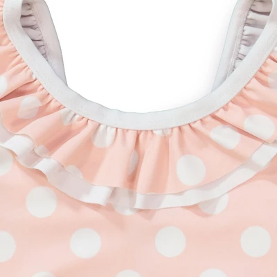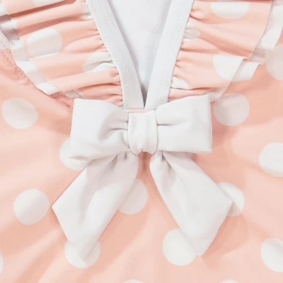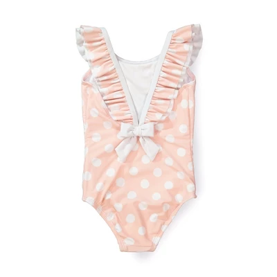 Watch out sunshine, here she comes! Made from our super comfy (and not to mention eco-friendly recycled nylon) swim fabric, this adorable strappy one-piece is perfect for everything from swan dives to sandcastles. Features an adorable double tiered ruffle along the collar and deep v-back with bow detail.