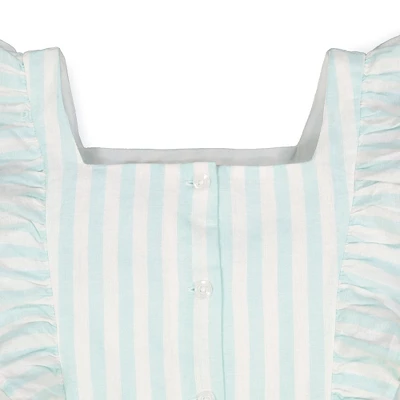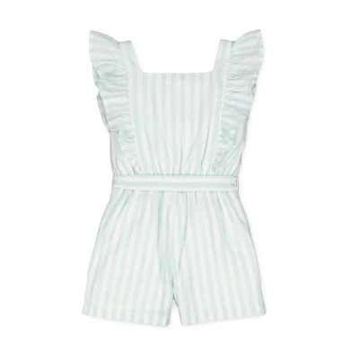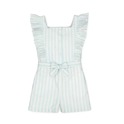 Sweet flutter sleeves add a super cute and on-trend touch to our lightweight romper in a beautiful organic cotton linen blend fabric. Fully lined and features a button front, elastic in the back waistband, and a waist sash with bow for that girly touch. Get the camera ready for those picture perfect moments!