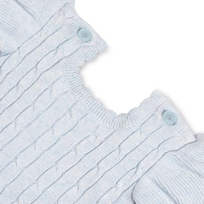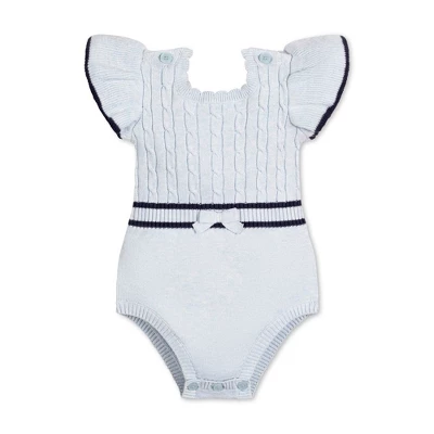 The sweetest look for all her adventures big and small. Carefully knit from soft organic cotton, this adorable flutter sleeve sweater romper has a cable knit bodice, a rib knit waistband with stripe and bow detail, and scalloped trim. Features buttons at the shoulders and inseam to make quick changes a breeze.